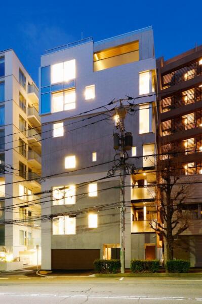 お洒落な建物が並ぶ駒沢通り沿い広尾の地に6階建(ペントハウス付)賃貸併用住宅が竣工しました。。外観はRC打ち放しとカーテンウォールが融合したデザインで最上階リビングから続くペントハウスにはジャクジーを設置。優雅な空間が出来上がりました。